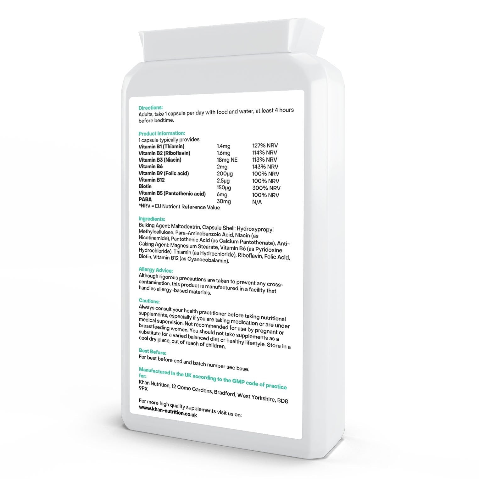 Ingredients:Bulking Agent: Maltodextrin, Capsule Shell: Hydroxypropyl Methylcellulose, Para-Aminobenzoic Acid, Niacin (as Nicotinamide), Pantothenic Acid (as Calcium Pantothenate), Anti-Caking Agent: Magnesium Stearate, Vitamin B6 (as Pyridoxine Hydrochloride), Thiamin (as Hydrochloride), Riboflavin, Folic Acid, Biotin, Vitamin B12 (as Cyanocobalamin).