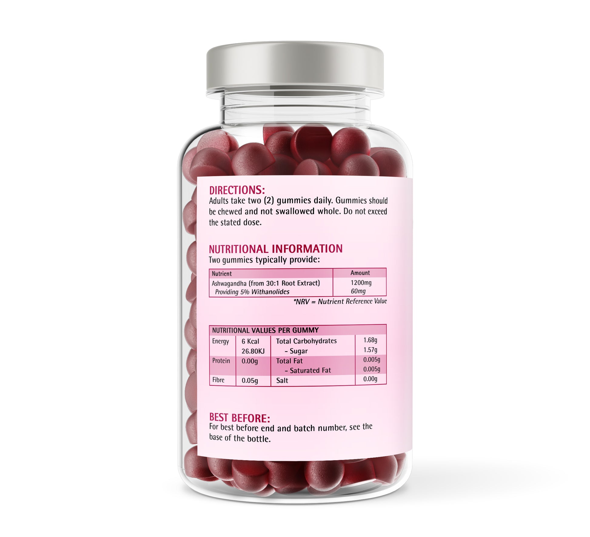 Ingredients:Glucose Syrup, Sugar, Water, Pectin (Gelling Agent), Citric Acid (Acid), Ashwagandha Root Extract (Withania somnifera), Maltodextrin, Trisodium Citrate (Acidity Regulator), Coconut Oil (Oil Coating), Anthocyanins (Natural colouring), Magnesium Citrate, Natural Raspberry Flavouring, Carnauba Wax (Anti-caking Agent).