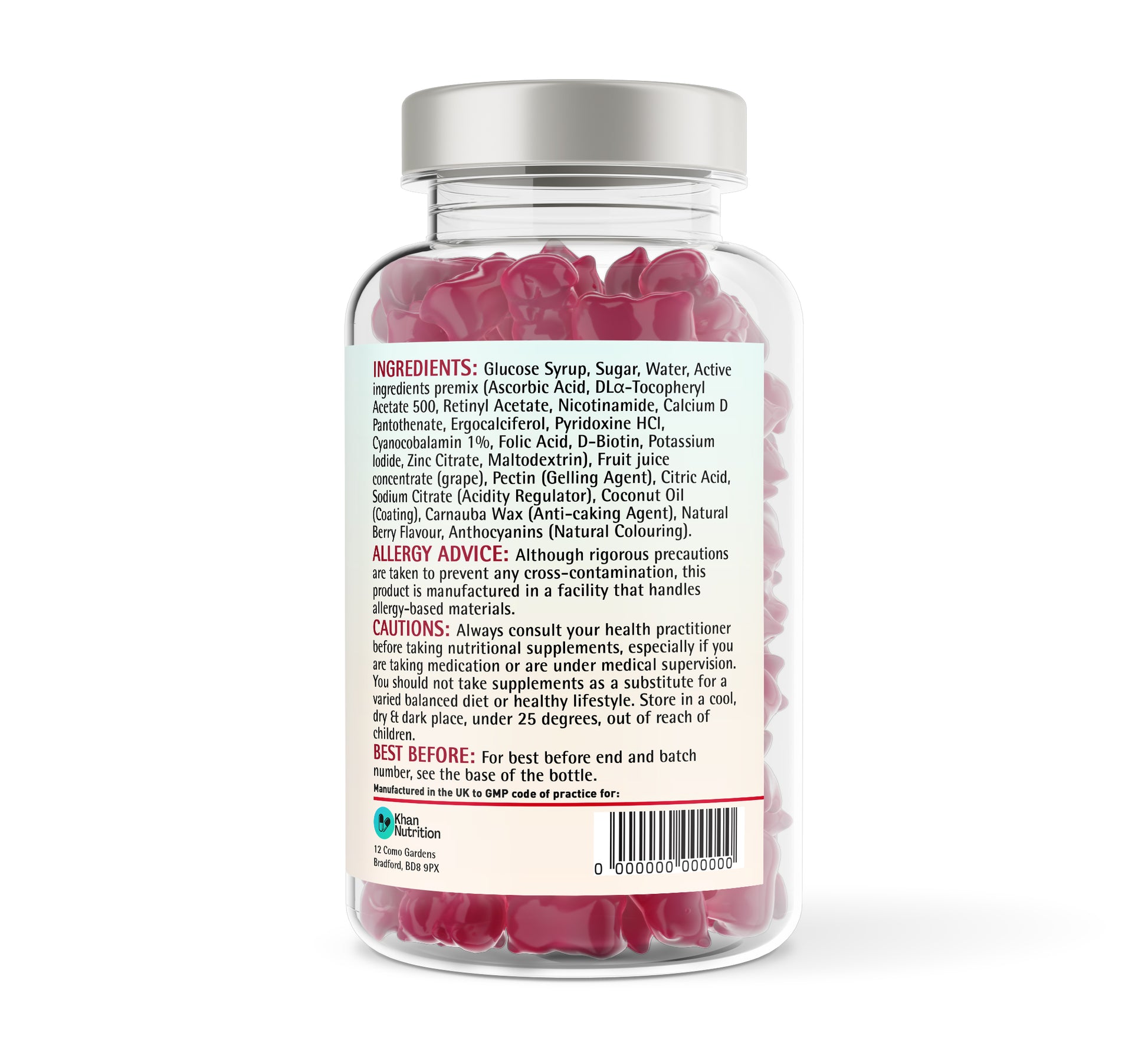 Ingredients: Glucose Syrup, Sugar, Water, Active ingredients premix (Ascorbic Acid, DLα-Tocopheryl Acetate 500, Retinyl Acetate, Nicotinamide, Calcium D Pantothenate, Ergocalciferol, Pyridoxine HCl, Cyanocobalamin 1%, Folic Acid, D-Biotin, Potassium Iodide, Zinc Citrate, Maltodextrin), Fruit juice concentrate (grape), Pectin (Gelling Agent), Citric Acid, Sodium Citrate (Acidity Regulator), Coconut Oil (Coating), Carnauba Wax (Anti-caking Agent), Natural Berry Flavour, Anthocyanins (Natural Colouring).