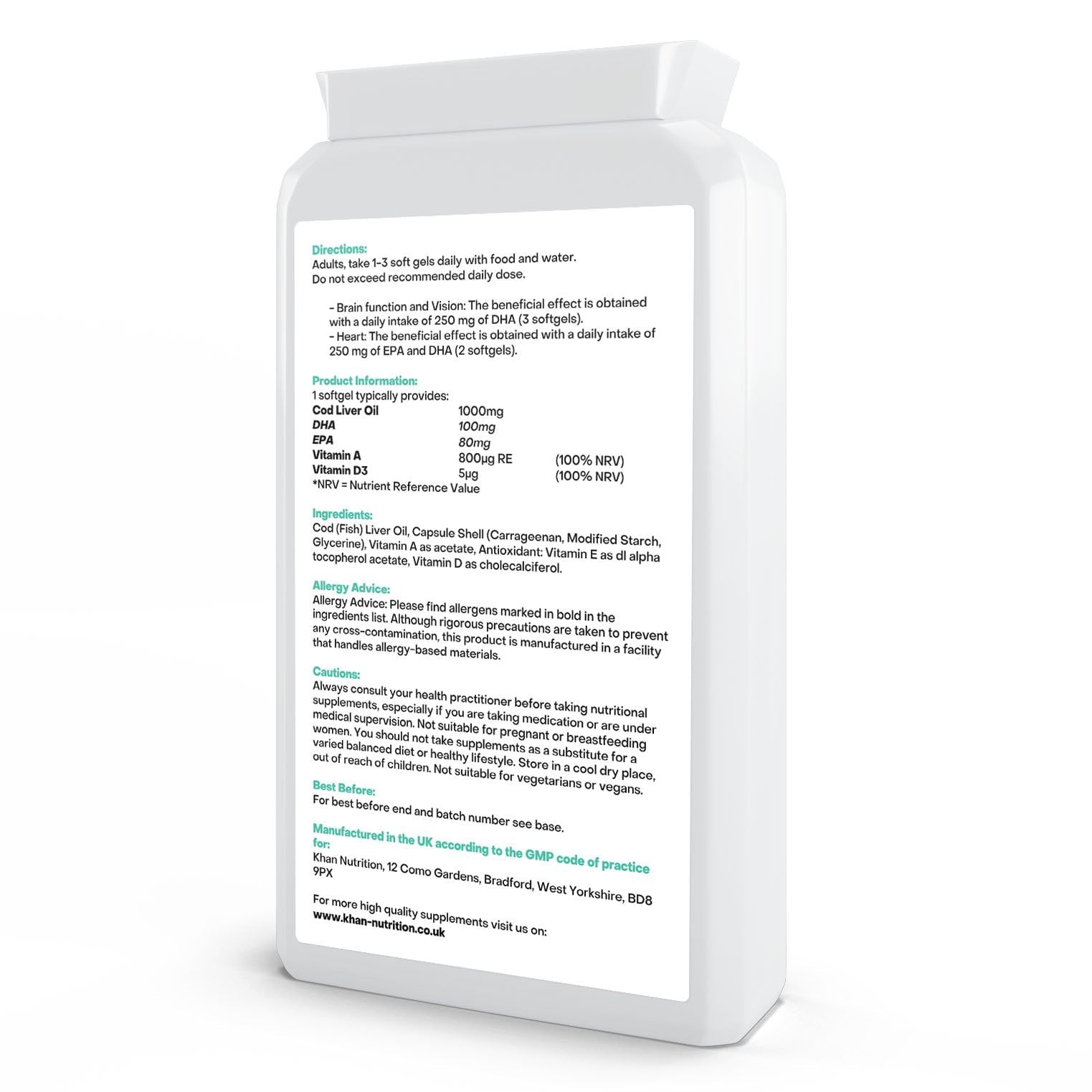 Ingredients:Cod (Fish) Liver Oil, Capsule Shell (Carrageenan, Modified Starch, Glycerine), Vitamin A as acetate, Antioxidant: Vitamin E as dl alpha tocopherol acetate, Vitamin D as cholecalciferol.