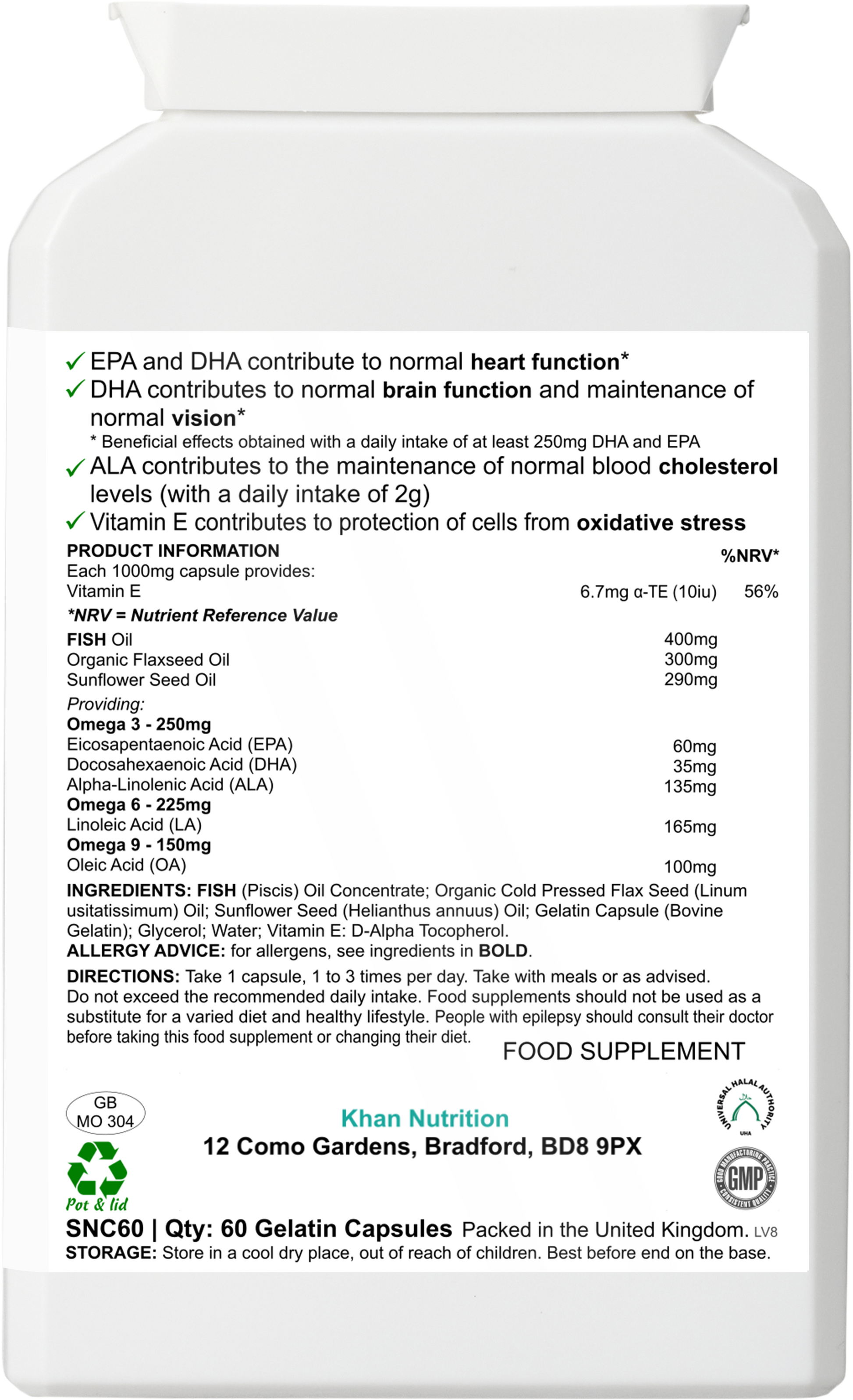 A new and improved formula - now with a complete Omega 3-6-9 blend in halal-certified gelatine softgels.
